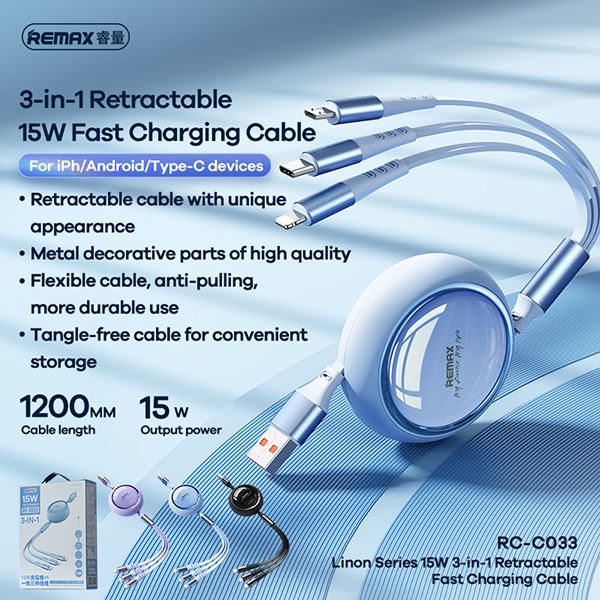 Cáp sạc dây rút đa năng 15w 3IN1 REMAX RC-C033