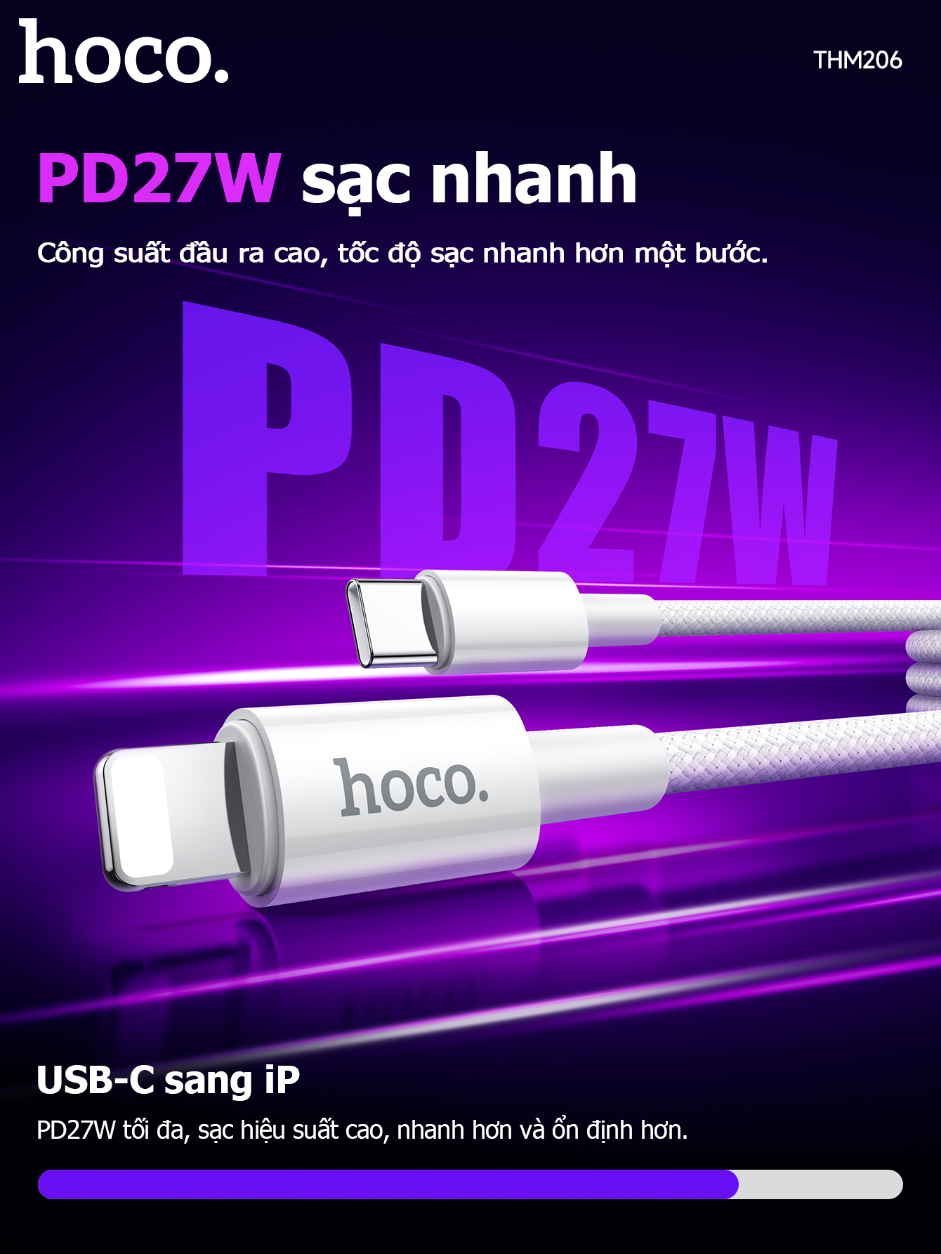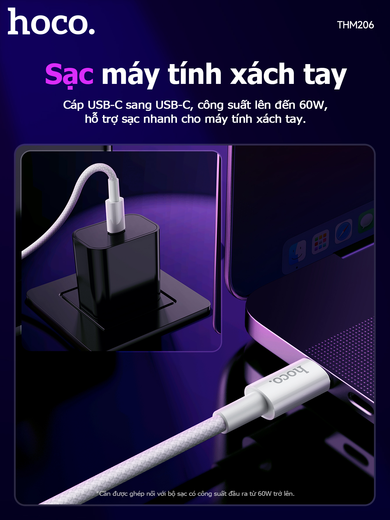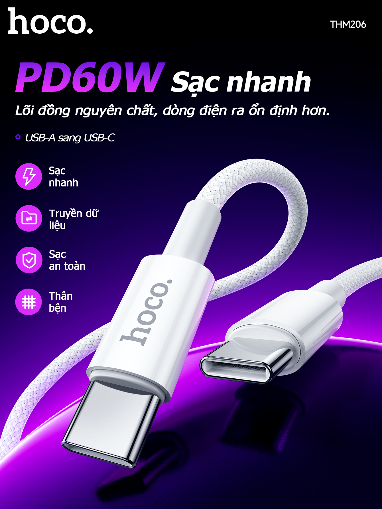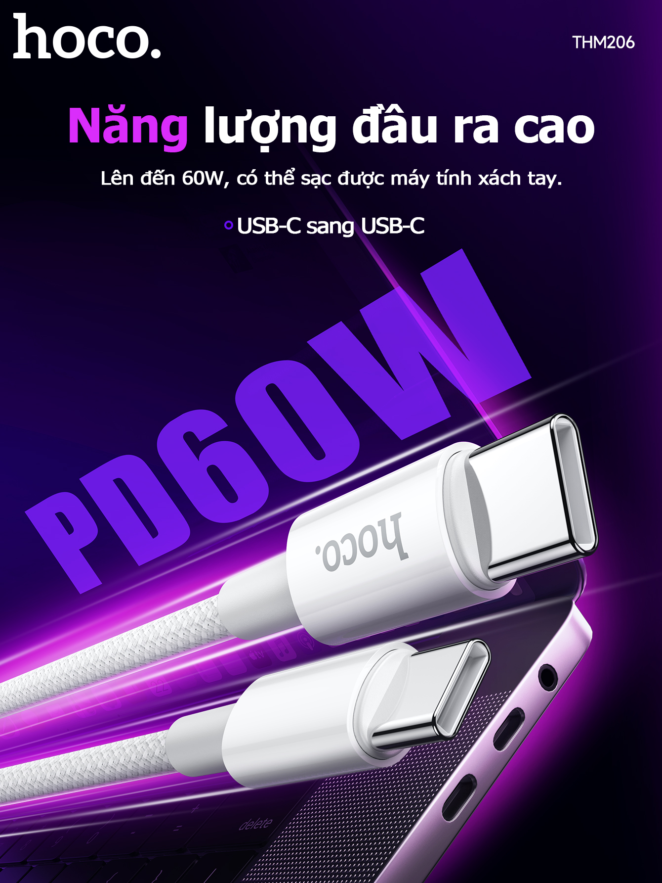 Cáp sạc dữ liệu chính hãng THM206 60W Type-C cho Type-C (Dài = 1M)