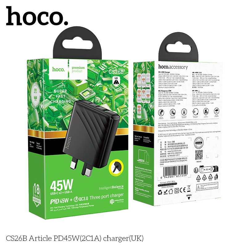 USB-A:18W(QC/FCP/AFC); C1+C2=45W+20W; C1+A=45W+18W; C2+A=5V/3A; C1+(C2+A)=45W+15W