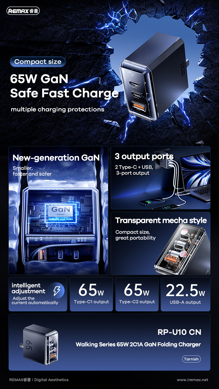Cốc sạc nhanh REMAX RP-U10 CN GaN 65W 1USB+2Type C