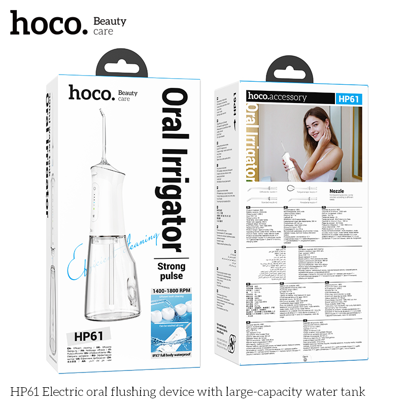 7. Phụ kiện; 5 đầu phun (2 * tiêu chuẩn + 1 * cạo lưỡi + 1 * chỉnh nha + 1 * nha chu) + cáp sạc