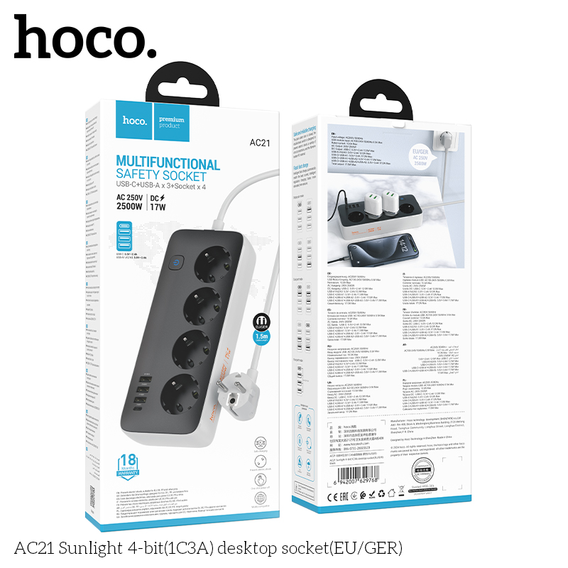 2. Ổ cắm 4 vị trí, công suất 2500W (phích cắm: Đức/Pháp/Châu Âu)