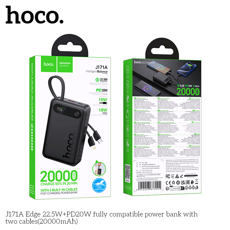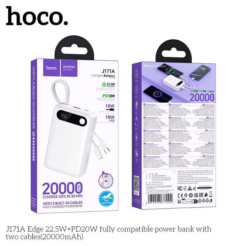 Sạc dự phòng J171A Edge 22.5W + PD20W tương thích hoàn toàn với hai cáp (20000mAh)