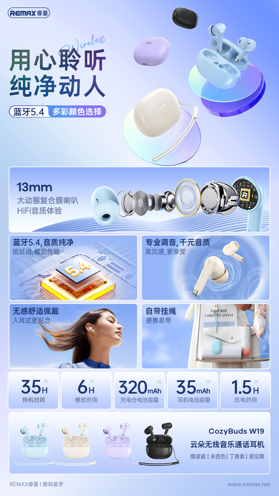Tai nghe REMAX W19 Cloudth Series Wireless Earbuds for Music and Call CozyBuds